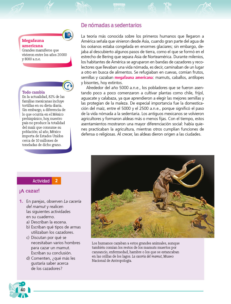 Los alumnos deben responder las siguientes preguntas: -Describe la escena. -Tipos de armas que utilizaban. -Por que se necesitaban varios hombres para cazar un mamut. -¿Qué más les gustaría saber acerca de los cazadores?